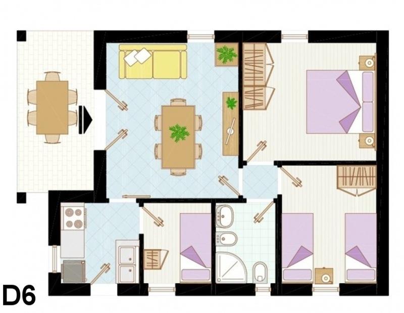 D6: (max. 6 osôb) dve spálne po dvoch lôžkach, spálňa s jedným lôžkom, denná miestnosť s rozkladacím lôžkom a kuchynským kútom.