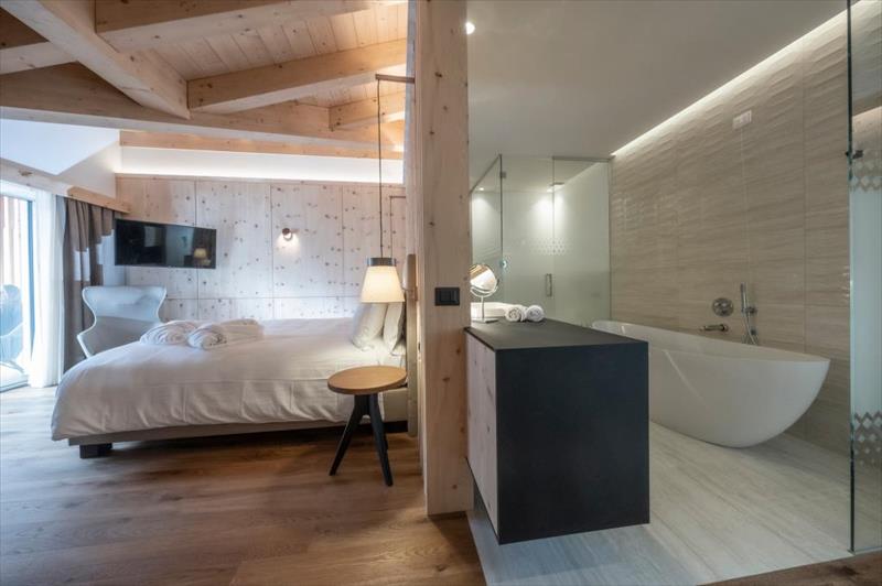 Junior Suite Roda di Vael (pre 2/4 osoby) má parketové podlahy, súkromná kúpeľňa so sušičom vlasov a županom,TV,telefón,WiFi pripojenie,bezpečné,minibar,kúrenie, set na prípravu kávy a čaju a balkón vybavený stolom a stoličkami. externé.