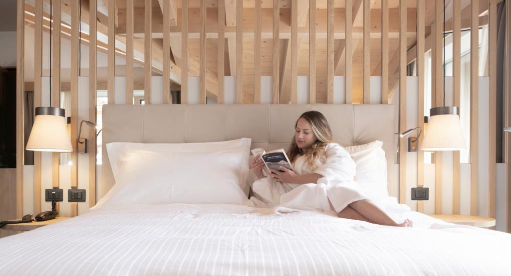 Junior Suite Cima Dodici (pre 2/3 osoby) má vlastnú kúpeľňu so sušičom vlasov a županom,TV,telefón,WiFi pripojenie,bezpečné,minibar,kúrenie, rozkladacia pohovka a balkón a terasa s výhľadom na hory.
