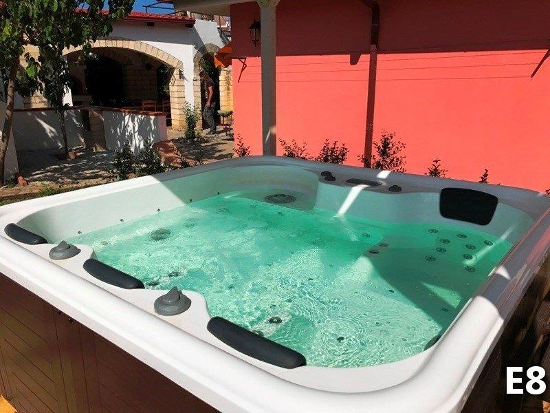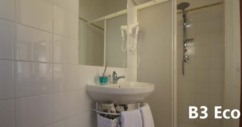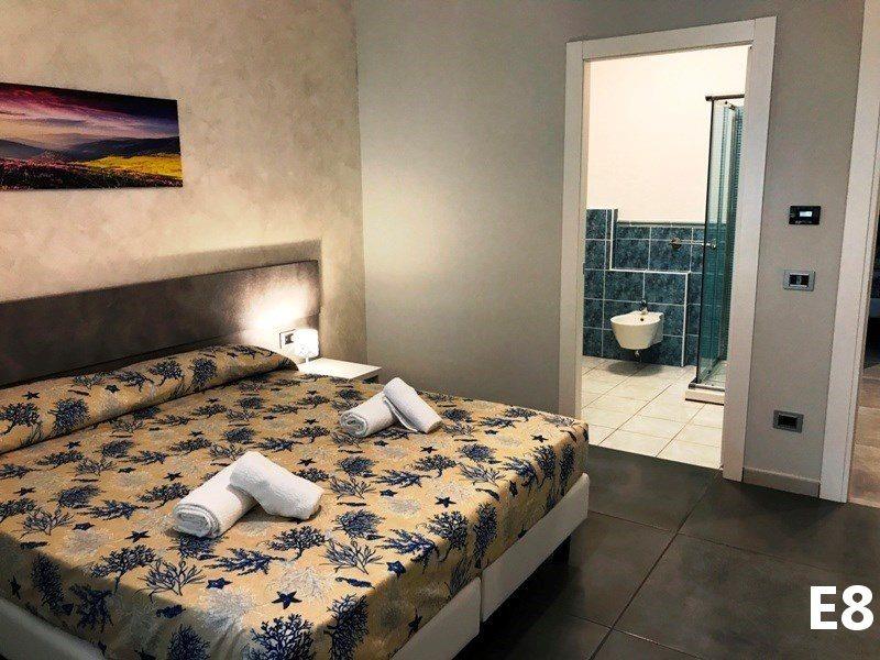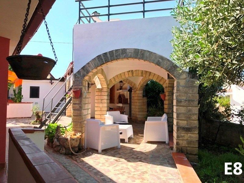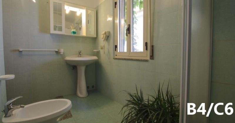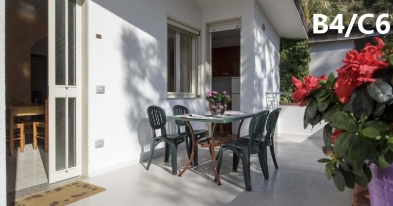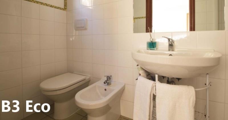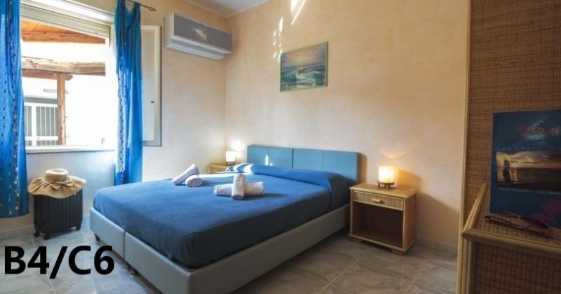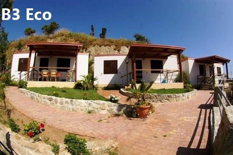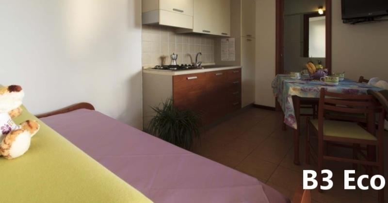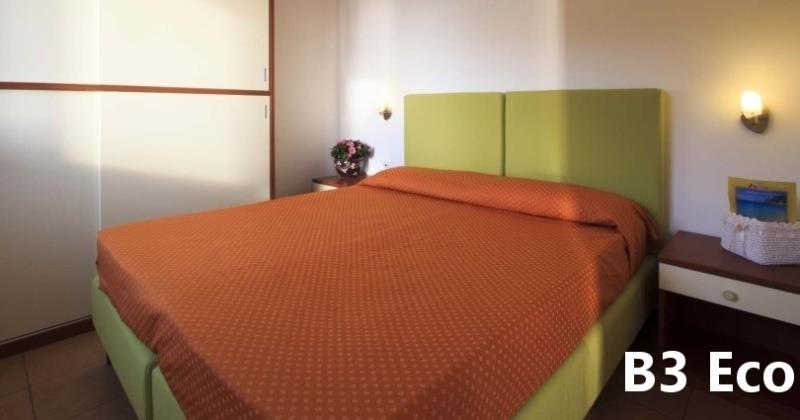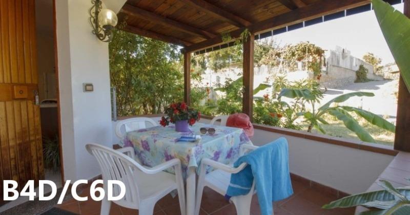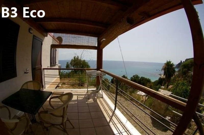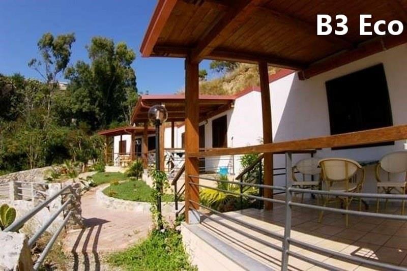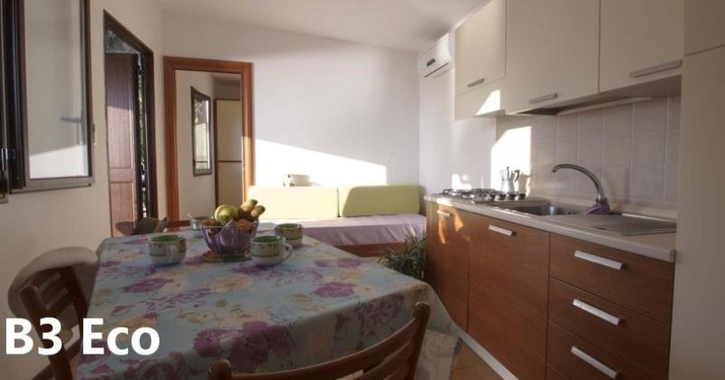 B3 ECO CASA: (max. 3 osoby) spálňa s dvojlôžkom, denná miestnosť s rozkladacím lôžkom a kuchynským kútom, SPR+WC, fén, TV/SAT, klimatizácia, veranda so záhradným nábytkom, výhľad na more.