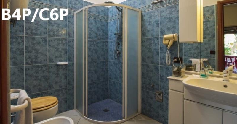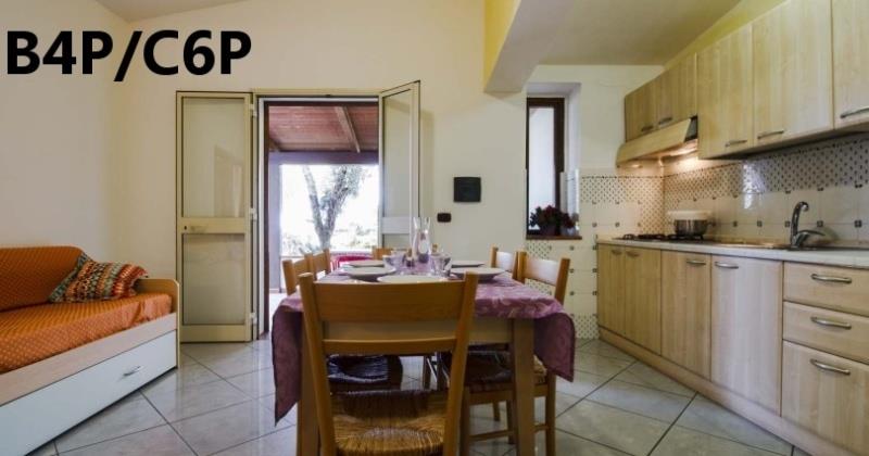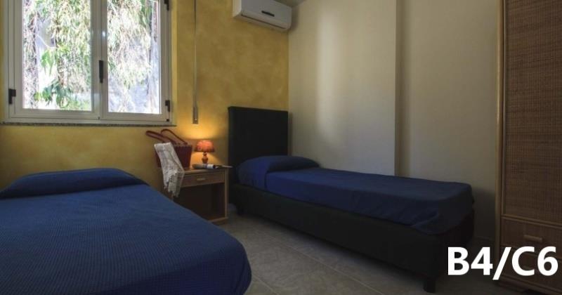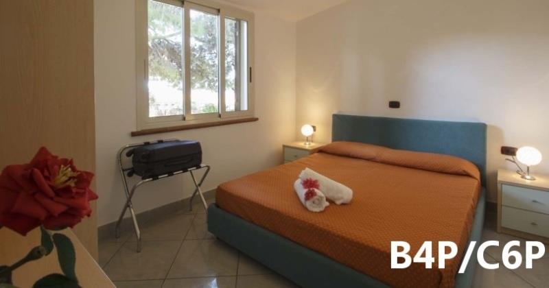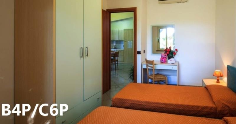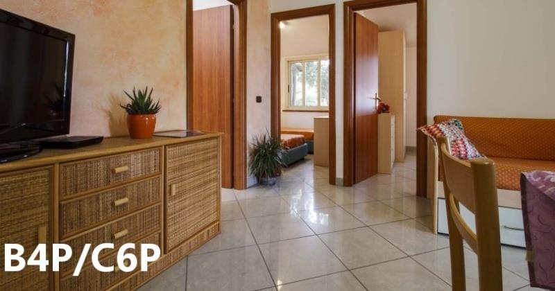 C6P: (max. 6 osôb) dve spálne po dvoch lôžkach, denná miestnosť s rozkladacím dvojlôžkom a kuchynským kútom, SPR+WC, fén, TV/SAT, klimatizácia, veranda so záhradným nábytkom, výhľad na more.