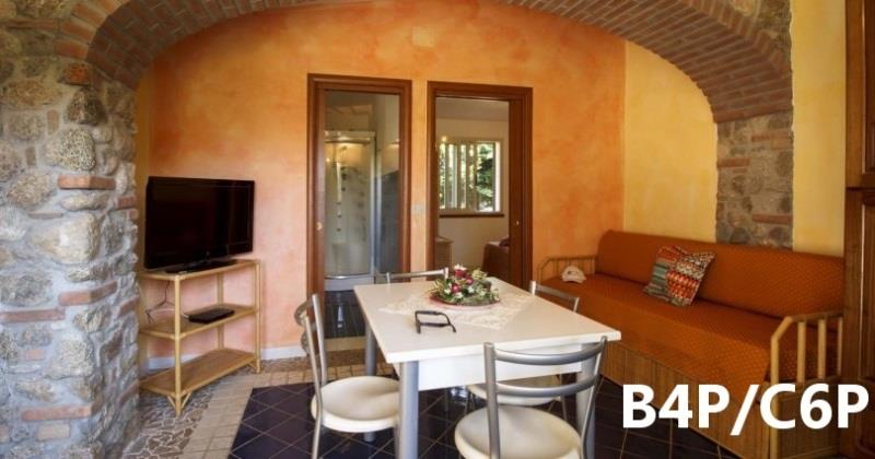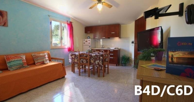 B4D: (max. 4 osoby) spálňa s dvojlôžkom, denná miestnosť s rozkladacím dvojlôžkom a kuchynským kútom, SPR+WC, TV/SAT, fén, klimatizácia, veranda so záhradným nábytkom.