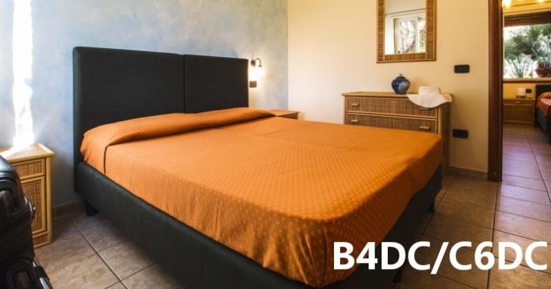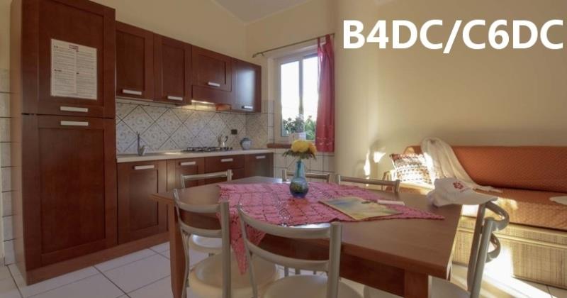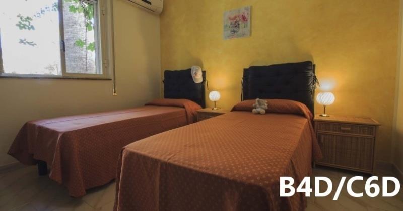 C6D: (max. 6 osôb) dve spálne po dvoch lôžkach, denná miestnosť s rozkladacím dvojlôžkom a kuchynským kútom, SPR+WC, fén, TV/SAT, klimatizácia, veranda so záhradným nábytkom.