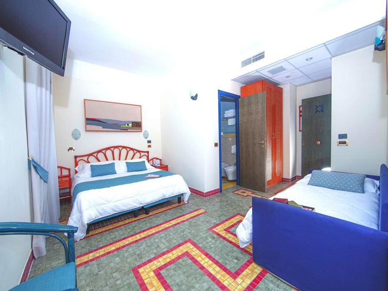 ŠTVORPOSTEĽOVÁ RODINNÁ IZBA Izba vhodná pre rodiny s deťmi s rozlohou približne 23 metrov štvorcových, vybavená všetkým komfortom a zariadená v modernom, rafinovanom štýle. Má sušič vlasov, telefón, Wi-Fi, satelitnú TV, minibar, klimatizáciu a balkón.