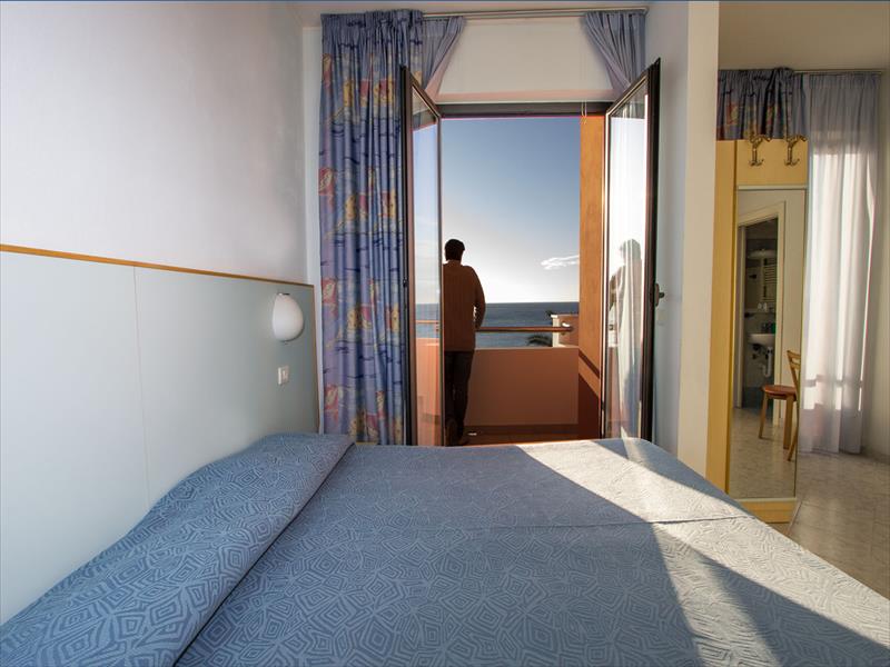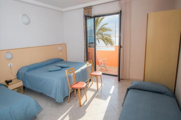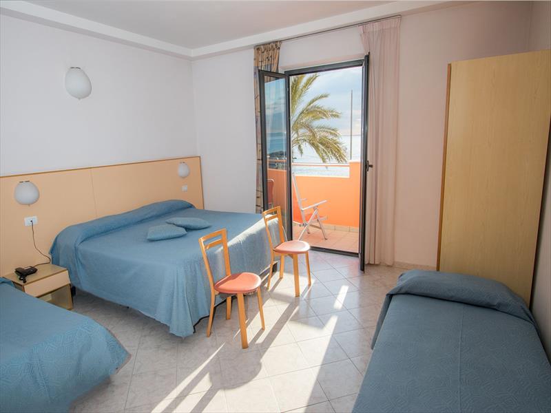 TROJLÔŽKOVÁ IZBA S BALKÓNOM A VÝHĽADOM NA MORE Izba pre tri osoby s výhľadom na more, na požiadanie pre osoby so zdravotným postihnutím, s fénom, telefónom, Wi-Fi, satelitnou TV, trezorom, klimatizáciou a balkónom.