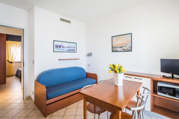 DVOJIZBOVÝ KOMFORTNÝ APARTMÁN PRE 6 OSÔB Dvojizbový apartmán pre 6 osôb, približne 35 m2, pozostávajúci zo spálne s manželskou posteľou a poschodovou posteľou, obývacej izby s rozkladacou pohovkou pre dve osoby a kuchynským kútom, kúpeľne s vaňou alebo sprchovacím kútom, vybaveného balkóna (1 slnečník a 1 ležadlo) s výhľadom na more. Tento typ izby je tiež vybavený umývačkou riadu a klimatizáciou.