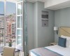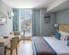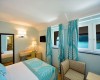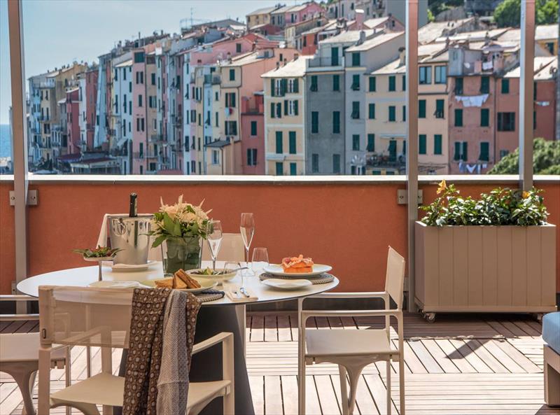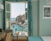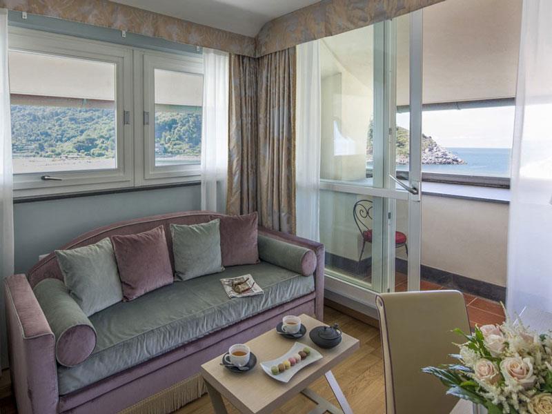 JUNIOR SUITA PRE 2 OSOBY Tento typ je vybavený panoramatickou terasou a vyžaruje krásu a atmosféru Portovenere. Na mieru vyrobené skrine, písacie stoly a nočné stolíky boli navrhnuté v štýle šesťdesiatych rokov, obzvlášť plodného obdobia pre všetko vyrobené v Taliansku. Čelá postelí, tiež vyrobené na mieru, majú šesťuholníkový motív a tkanú látku v odtieňoch morskej modrej. K dispozícii je telefón s priamou voľbou, klimatizácia, minibar, fén a darčekový podnos.