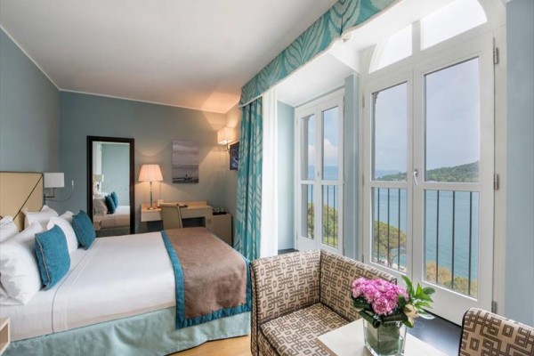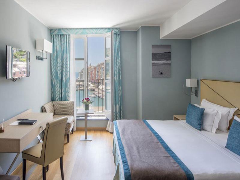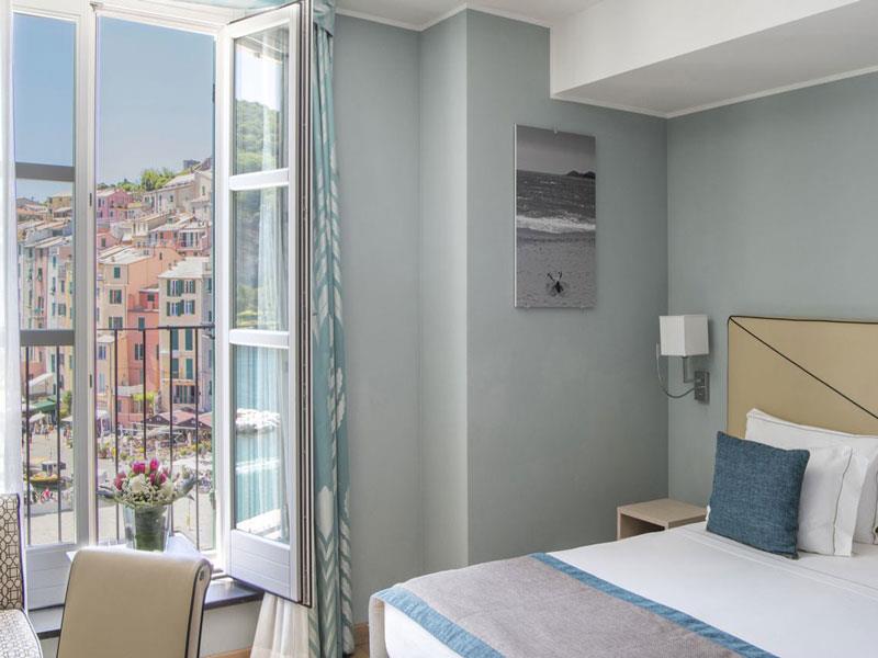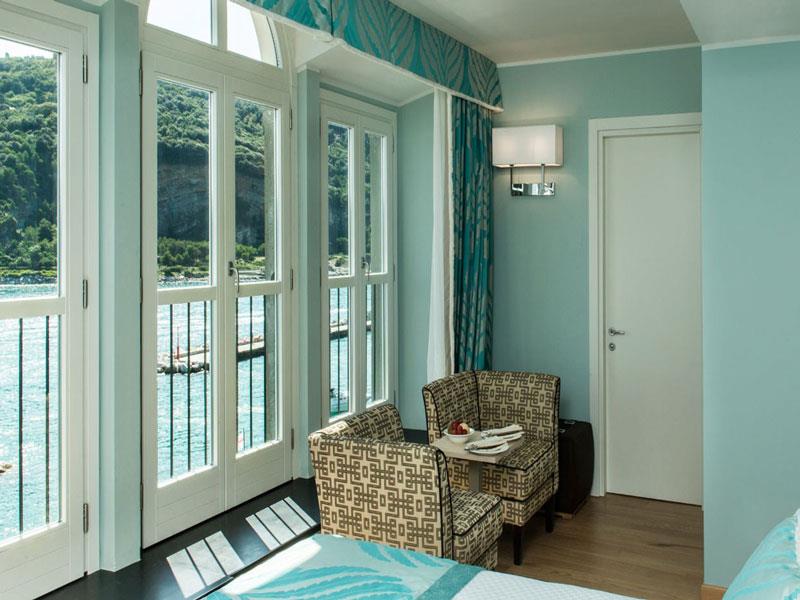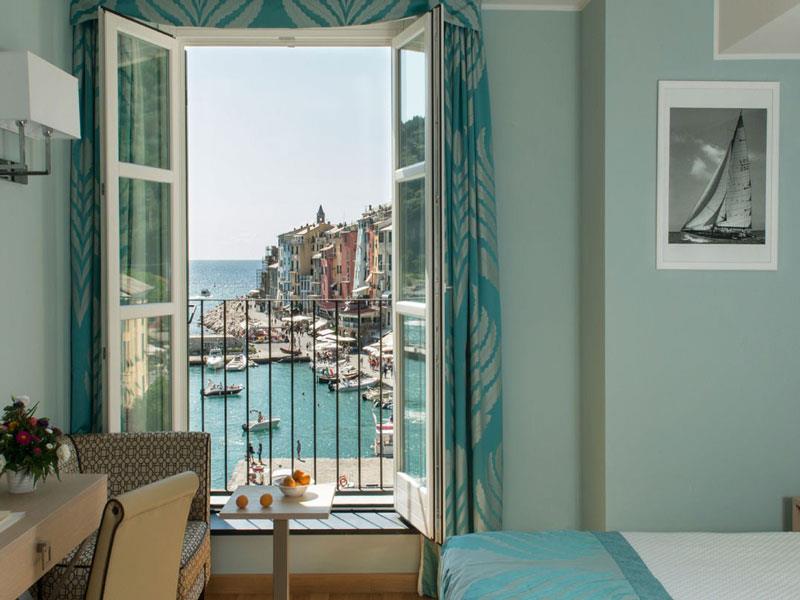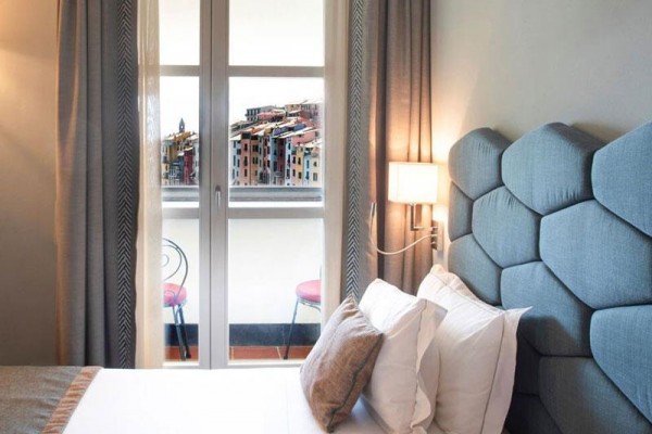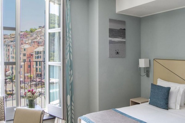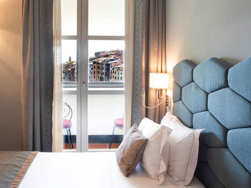 DVOJLÔŽKOVÁ DE LUXE IZBA S VÝHĽADOM NA MORE Izby Deluxe sa nachádzajú v našej historickej budove a sú svetlé a majú veľké okná. Naskytá sa z nich výhľad na ostrov Palmaria alebo na hrad a okolité kopce Portovenere. Každá izba Deluxe má jedinečné architektonické prvky a niektoré majú terasu alebo balkón. Vzácne a moderné textúry sa prelínajú a nachádzajú svoj maximálny výraz v detailoch. Veľké okná umožňujú farbám stien odrážať oblohu a rôzne odtiene, čím vytvárajú symbiotický vzťah s prírodnými živlami. K dispozícii je telefón s priamou voľbou, klimatizácia, minibar, fén a darčekový podnos.