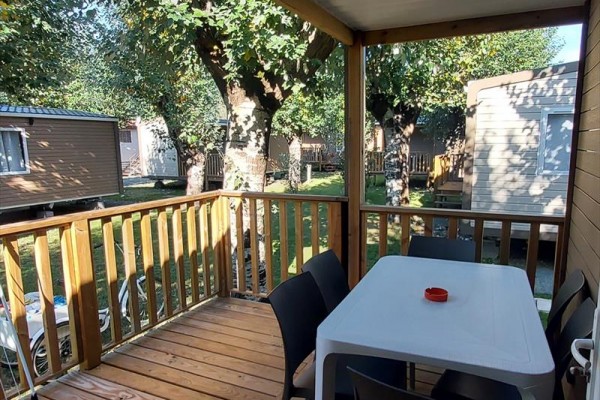 MOBILNÝ DOM PRE 5 OSÔB Mobilný dom s krytou verandou o rozlohe približne 32 m2, pozostávajúci z: prvej spálne s manželskou posteľou (zloženej z 2 samostatných lôžok), druhej spálne s 2 samostatnými lôžkami, kúpeľne so sprchovacím kútom/WC, obývacej izby s kuchynským kútom a rozkladacou pohovkou (1 miesto). Veranda so stolom a stoličkami. Ponúka kúpeľňu so sprchovacím kútom, satelitnú TV, sušič vlasov, klimatizáciu a kúrenie podľa miestnych štandardov.