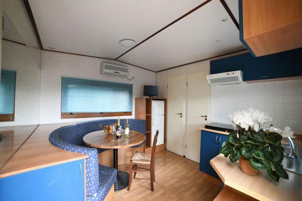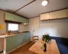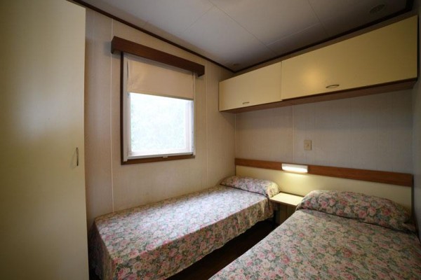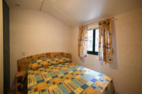 MOBILNÝ DOM TYPU C PRE 2/3 OSOBY Chata-mobilhome pre 2/3 osoby s rozlohou približne 30 metrov štvorcových. Pozostáva z obývacej izby s kuchynským kútom vybaveným plynovým sporákom so 4 horákmi a chladničkou s mrazničkou, spálne s manželskou posteľou, spálne s poschodovou posteľou a jednolôžkovým lôžkom alebo 3 jednolôžkovými posteľami. Dve kúpeľne (1 so sprchovacím kútom a WC a 1 iba s WC), vybavená vonkajšia plocha. Klimatizácia a kúrenie. Zariadená vonkajšia plocha so stoličkami alebo lavicami a stolom. Rezervované parkovanie vedľa budovy.
