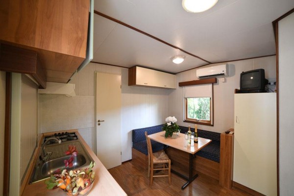 MOBILNÝ DOM - TYP C PRE 5 OSÔB Chata-mobilhome pre 4/5 osôb s rozlohou približne 30 metrov štvorcových. Pozostáva z obývacej izby s kuchynským kútom vybaveným plynovým sporákom so 4 horákmi a chladničkou s mrazničkou, spálne s manželskou posteľou, spálne s poschodovou posteľou a jedným alebo tromi samostatnými lôžkami. Dve kúpeľne (1 so sprchovacím kútom a WC a 1 iba s WC), vybavená vonkajšia plocha. Klimatizácia a kúrenie. Zariadená vonkajšia plocha so stoličkami alebo lavicami a stolom. Rezervované parkovanie vedľa budovy.